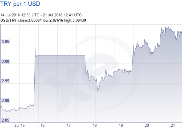 თურქეთში არსებული პოლიტიკური არასტაბილურობა ეროვნულ ვალუტაზე – ლირაზე უარყოფითად აისახა. 15 ივლისს, სამხედრო ამბოხის დაწყებამდე, 1 დოლარი 2.89 ლირა ღირდა, დღეს კი 1 დოლარი 3.08 ლირა ღირს, რაც ისტორიული მაქსიმუმია. აქამდე, ყველაზე მაღალი კურსი 2015 წლის სექტემბერში დაფიქსირდა, როცა 1 დოლარი 3.06 ლირა ღირდა.