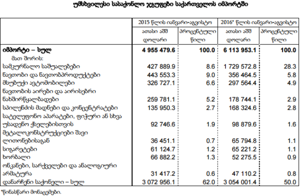 2016 წლის იანვარ-აგვისტოში, სასაქონლო ჯგუფებიდან, საიმპორტო ათეულში პირველი ადგილი სამკურნალო საშუალებებმა დაიკავა 1.7 მილიარდი აშშ დოლარით და მთელი იმპორტის 28.3 პროცენტი შეადგინა. თუმცა, სამკურნალო საშუალებების იმპორტიდან დაახლოებით 1.3 მილიარდი დოლარი “ც ჰეპატიტის” სამკურნალო საშუალებების იმპორტზე მოდის, რაც რეალურად გრანტის სახით მოგვეწოდება და რეალურად ფულს არ ვიხდით.