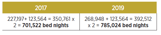 Demand is made up of international and domestic tourists who intend to travel for holiday, leisure recreation, pilgrimage, business or professional reasons. In order to estimate the sales generated from these visitation figures, based on survey responses we assume two nights’ stay per visit. Below is the calculation for bed nights (occupancy for one person on a single night) for 2017, as well as projections for 2019.