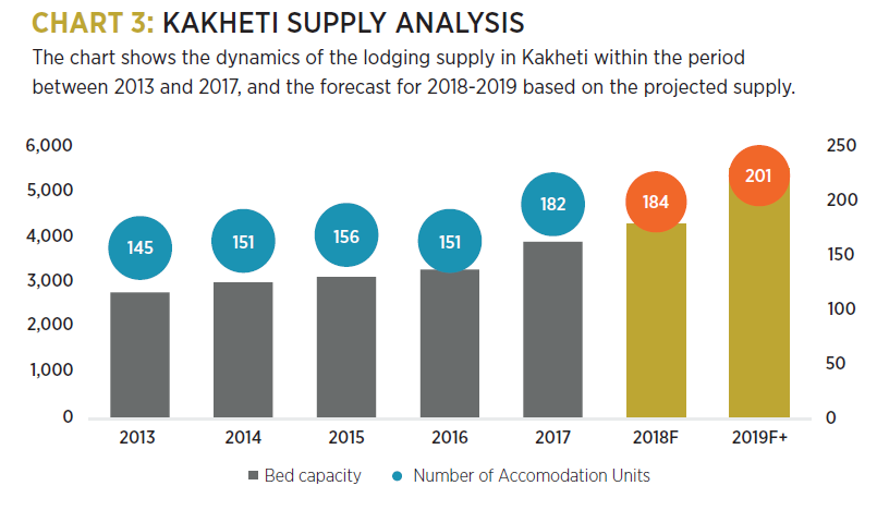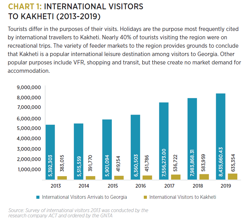 - The growth rate of international visitor arrivals to Georgia between 2013 and 2017 was used as the assumed growth rate for international visitors to Kakheti. The figures were as follows: 2.3%, 7%, 7.8%, 18.8% growth.