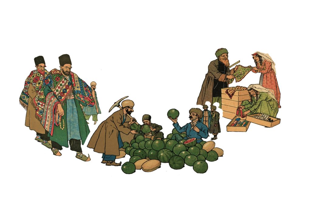 „ბაზრის ფარდულებში ნაირფერ პირამიდებადაა ხილი დახვავებული; აქ ფეხსაცმელს კერავენ, იქ ცხვრის ტყავებია დაგროვილი, აქ ღვინის ტიკები ელიან მომხმარებლებს, იქვე მომხიბლავ მორთულობას ქმნიან გამოფენილი ხალიჩები. აი, ფარდულები, სადაც ვერცხლს ფილიგრამებად გარდაქმნიან, რომელიც ჩვენს თვალწინ ნაზი მაქმანივით იშლება”, – ბარონი დე ბაი.