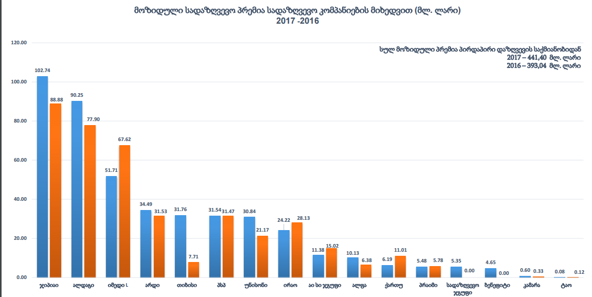 წლიურად სადაზღვევო კომპანიების მოგება 1.5 მილიონი ლარით გაიზარდა. მოზიდული სადაზღვევო პრემიით GPI ლიდერობს (102,7 მლნ ლარი), მას მოსდევს ალდაგი (90 მლნ ლარი) და იმედი L (51.7 მლნ ლარი). მოზიდული პრემიით მეოთხე ადგილზე არდია (34 მლნ ლარი), მეხუთე პოზიციაზე კი თიბისი დაზღვევა (31.7 მლნ ლარი). პსპ-ს მიერ მოზიდულმა სადაზღვევო პრემიამ გასულ წელს 31.5 მლნ ლარი შეადგინა, უნისონმა 30 მლნ ლარის სადაზღვევო პრემია მიიზიდა, ხოლო ირაომ 24.2 მლნ ლარის.