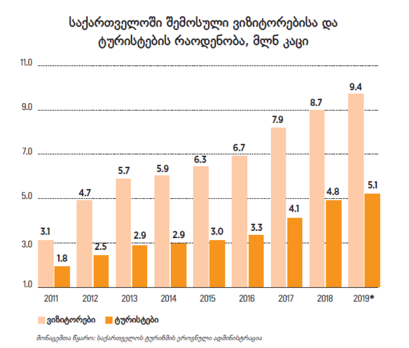 საერთაშორისო ტურიზმი 2019 წელს საქართველოში 9,358,000 ვიზიტორი ჩამოვიდა, რაც რეკორდული და, შეიძლება ითქვას, მოულოდნელი რიცხვიცაა. ვიზიტორებში ითვლება ნებისმიერი სხვა ქვეყნის რეზიდენტი, რომელმაც საქართველოს საზღვარი გადმოკვეთა, ესენია: ტურისტები (ვინც საქართველოში, მინიმუმ, 24 საათს გაჩერდა), ერთდღიანი ვიზიტები და ტრანზიტი. 2018 წელთან შედარებით, 2019 წელს საქართველოში 678 ათასით (7.8%-ით) მეტი ვიზიტორი შემოვიდა, ხოლო ტურისტების რაოდენობა 324 ათასით (6.8%-ით) გაიზარდა და 5.1 მლნ-ს მიაღწია.
