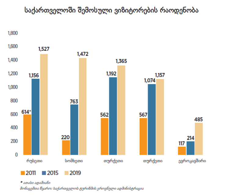 2018 წელს რუსი ვიზიტორების წილი მთლიან ვიზიტორებში 16.2% იყო, 2019 წელს კი 15.7%-მდე შემცირდა. 2019 წელს ყველაზე დიდი კლება იყო ირანიდან, 149 ათასი ვიზიტორით ნაკლები ჩამოვიდა, რაც ძირითადად საქართველოს მიერ ირანის მოქალაქეების შემოშვებაზე გამკაცრებულმა წესებმა განაპირობა. ირანიდან ტურისტების კლებით საქართველომ, სულ ცოტა, 50 მლნ დოლარი დაკარგა. ტურიზმის მხრივ საკმაოდ კარგად დაიწყო 2020 წელი. მიუხედავად იმისა, რომ იანვარში ზამთრის კურორტებზე თოვლის ნაკლებობა და წყლის მიწოდების პრობლემები იყო, ვიზიტორების რაოდენობა 20%- ით, ხოლო ტურისტების 19%-ით გაიზარდა. ზრდა ძირითადად აზერბაიჯანიდან, სომხეთიდან და თურქეთიდან ვიზიტორთა მატებამ განაპირობა. ზრდა დაფიქსირდა რუსეთიდანაც – 1.1%-ით.