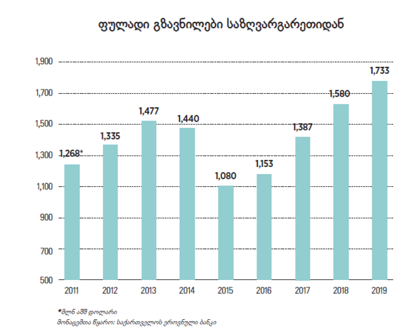 გვყავს ჭარბი დაბალკვალიფიციური სამუშაო ძალა, რომელზეც სიიაფის გამო განვითარებულ ქვეყნებში მოთხოვნაა. 2019 წელს საზღვარგარეთიდან საქართველოში 1.7 მილიარდი დოლარი გადმოირიცხა, რაც 2018 წლის გადმორიცხვებზე 154 მლნ დოლარით (10%-ით) მეტია. ყველაზე მეტად გზავნილები იტალიიდან (+46 მლნ დოლარი), საბერძნეთიდან (+22 მლნ დოლარი), აშშ- დან (+19 მლნ დოლარი) და უკრაინიდან (+13 მლნ დოლარი) გაიზარდა. 2013 წლის შემდეგ ფულად გზავნილებში ძალიან საინტერესო ტენდენციებია. 2014 წლის ბოლოდან მკვეთრად დაიწყო რუსეთიდან გზავნილების შემცირება, რაც ნავთობის ფასის კლებით და რუსეთზე დაწესებული სანქციებით იყო გამოწვეული.