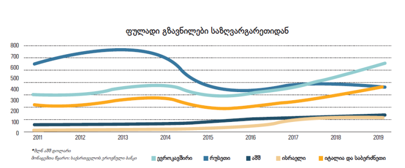 2019 წლის იანვრიდან რუსეთიდან გზავნილები ყოველთვე მცირდებოდა. ცალკე გამოსაყოფია ისრაელიდან ფულადი გზავნილების ზრდა, რაც 2015 წელთან შედარებით 5-ჯერ არის გაზრდილი. 2019 წელს ისრაელიდან 163 მლნ დოლარი გადმოირიცხა. 2020 წელიც ფულადი გზავნილების ზრდით დაიწყო. იანვარში 2019 წლის იანვართან შედარებით 10 მლნ დოლარით (8.6%-ით) მეტი გადმოირიცხა, რაც მნიშვნელოვანწილად იტალიიდან, უკრაინიდან, საბერძნეთიდან და აშშ- დან ჩამორიცხვების ზრდამ განაპირობა. რუსეთიდან ფულადი გზავნილები 1.4 მლნ დოლარით (5%-ით) შემცირდა. საინტერესო სურათია გრძელვადიან ჭრილშიც. 2005 წელს რუსეთის წილი გზავნილებში 60% იყო. მიუხედავად იმისა, რომ 2006 წელს ქართველების მასობრივი დეპორტაცია განხორციელდა, წილი გაიზარდა და 2007 წელს მაქსიმალურ დონეს – 63%-ს მიაღწია. 2008-დან კი კლების ტენდენცია დაიწყო და პირველობა 2018 წელს დათმო.