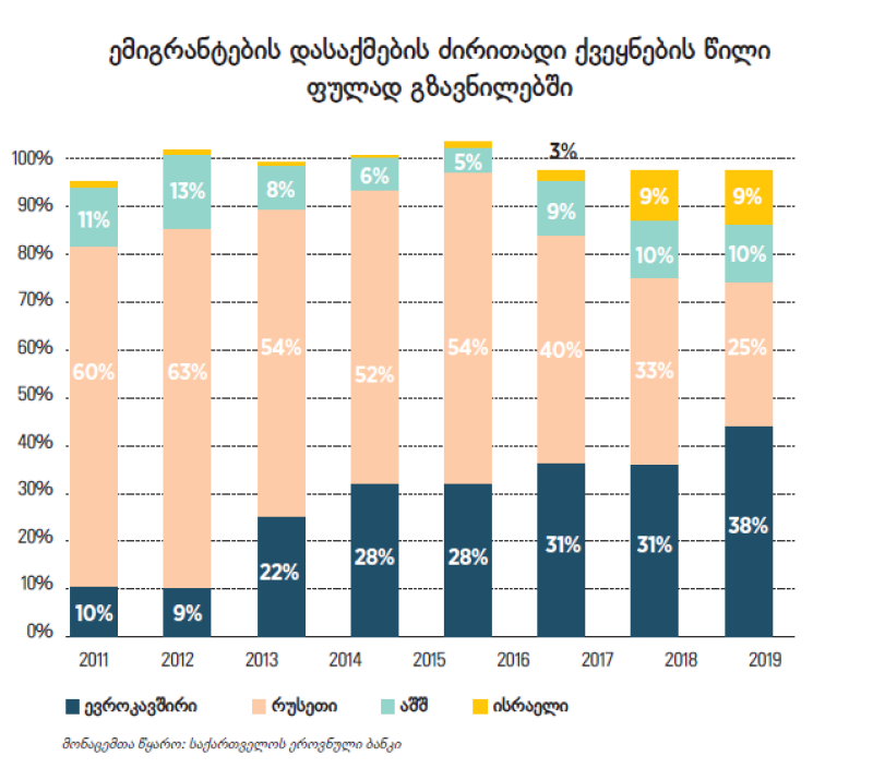 2019 წელს მთლიანი გზავნილების 38% ევროკავშირზე მოდიოდა, რუსეთის წილი კი 25%-მდე შემცირდა. მნიშვნელოვნად გაიზარდა ისრაელის წილიც. ევროკავშირიდან გზავნილების ზრდას და რუსეთიდან შემცირებას ერთი მთავარი მიზეზი აქვს: ახალი სამუშაო ძალა საქართველოდან ძირითადად ევროკავშირში მიდის და არა რუსეთში. რუსეთიდან გზავნილები ძირითადად 1990-იან და 2000-იან წლებში ემიგრაციაზეა დამოკიდებული, ემიგრანტების ახალი ნაკადი რუსეთში ნაკლებად მიდის. ამას ისიც უწყობს ხელს, რომ ევროკავშირთან უვიზო მიმოსვლა გვაქვს, რუსეთში შესასვლელად კი ვიზა გვჭირდება.