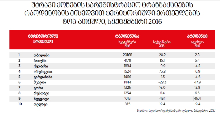 საჯარო რეესტრის ეროვნული სააგენტოს ოფიციალური მონაცემებით, 2016 წლის მესამე კვარტალში უძრავი ქონების სარეგისტრაციო ტრანზაქციათა რაოდენობა წინა წლის იმავე პერიოდთან შედარებით 17. 5%-ით გაიზარდა და ქვეყნის მასშტაბით 470844 ერთეული შეადგინა. მათგან 22% პირველად რეგისტრაციაზე, ხოლო 78% მეორეულ რეგისტრაციაზე მოდის. ტრადიციულად, ტერიტორიული ერთეულების მიხედვით თბილისი წამყვან ადგილს იკავებს. სექტემბერში დედაქალაქზე ქვეყნის მასშტაბით განხორციელებული სარეგისტრაციო ტრანზაქციების ჯამურმა რაოდენობამ 37% შეადგინა.