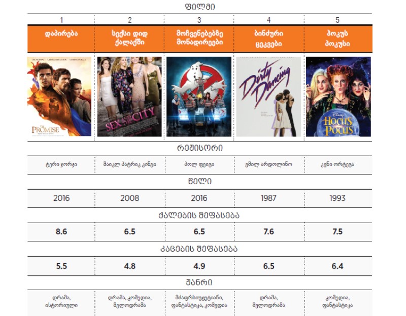სიის სათავეში ტერი ჯორჯის “დაპირებაა” – ფილმი ოსმალეთის იმპერიის პერიოდის სასიყვარულო სამკუთხედზე, რომელიც მთელი 3 ქულით მეტად დაფასებულია ქალებში, ვიდრე კაცებში. აი, თურმე რა სურთ. ფემინურ ტოპ-ხუთეულში ყველაზე მოულოდნელი ჩემთვის “მოჩვენებებზე მონადირეების” აღმოჩენა იყო. განუდევნელი სტერეოტიპები თუ რამეს მეუბნებოდა, ნიუ-იორკის ქუჩებში პარანორმალური არსებების დევნა უფრო ბიჭების თემა უნდა ყოფილიყო. “სექსს დიდ ქალაქში” და „ბინძურ ცეკვებს” ალბათ განხილვა არ სჭირდება. აი, მეხუთე ადგილზე გასული “ჰოკუს პოკუსის” ფოკუსი სავარაუდოდ მასში ახალგაზრდა სარა ჯესიკა პარკერის თამაშია.