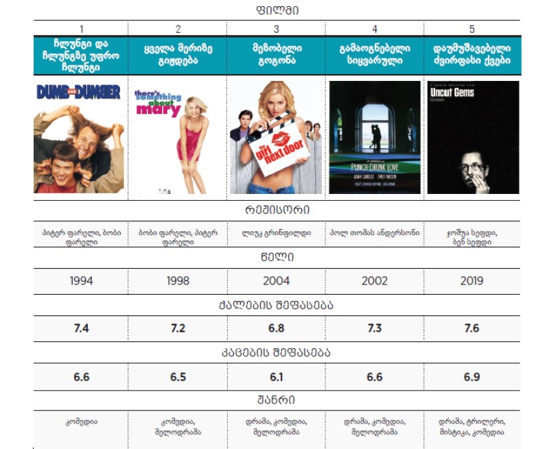 ქალებს ალბათ გაახარებთ სიმბოლიზმი – ფილმი, რომელიც ყველაზე დიდი უპირატესობით სარგებლობს კაცებში: “ჩლუნგი და ჩლუნგზე უფრო ჩლუნგი“. კაცურ სიაში მეორე ადგილიც ძმები ფარელიების რეჟისურისაა – ან კემერონ დიაზის შარმის, რომელზეც ყველა გიჟდება. მესამე პოზიცია ქალებს კიდევ ერთხელ ბოროტად ჩააცინებს – „მეზობელი გოგონა” არის ფილმი ამბიციურ სტუდენტზე, რომელსაც უყვარდება მეზობლად დასახლებული პორნოვარსკვლავი. სხვას აბა, რას შეიძლება ელოდე კაცისგან. სამაგიეროდ, მეოთხეზე კაცურებში “გამაოგნებელი სიყვარულია“, რომელიც ალბათ ყველაფერს სჯობია, რაც ქალების სიაშია. თუნდაც იმიტომ, რომ პოლ თომას ანდერსონისაა. ოღონდ სიუჟეტს აღარ ჩავუღრმავდები. ჯამში მაინც ყველა კაცი ერთნაირია.