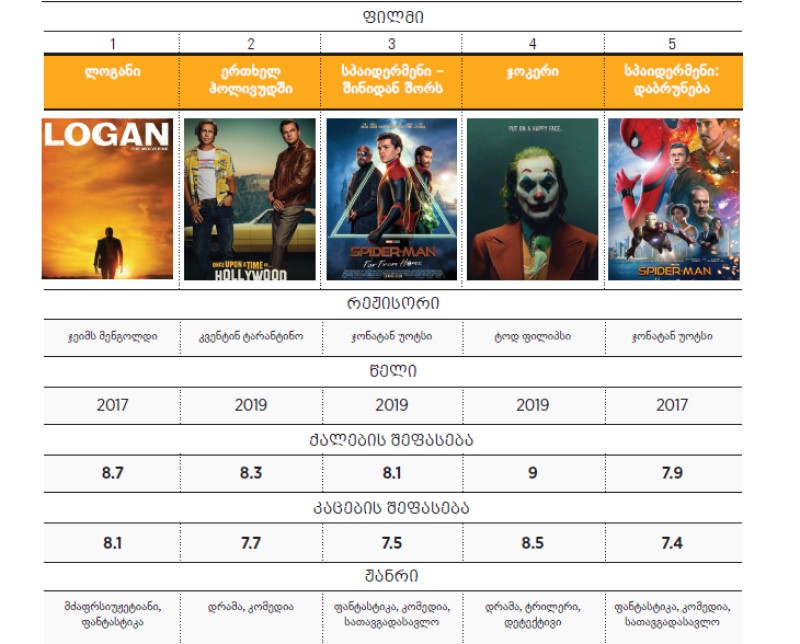 ტინეიჯერებთან ყველაფერი მარტივადაა: რა უყვართ სხვებზე მეტად? კომიქსის ეკრანიზაცია, კომიქსის ეკრანიზაცია, კომიქსის ეკრანიზაცია და კიდევ ერთი კომიქსის ეკრანიზაცია. ერთადერთი გამონაკლისი და მოულოდნელობა ამ ტოპ-ხუთეულში არის ტარანტინოს “ერთხელ ჰოლივუდში“. თუმცა ეკრანიზაციაცაა და ეკრანიზაციაც: ჯოკერიც აქაა და არაა გამორიცხული, ტინეიჯერებს უკვე მეტი გაეგებოდეთ კინოში, ვიდრე უფროს დეიდებს და ბიძიებს.