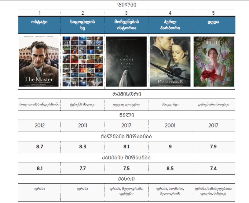 ყველაზე სერიოზული კინოს ხუთეული ალბათ მაინც იმ ფილმებისგან გამოვიდა, რომლებიც 18-29 წლისებს უფრო უყვართ, ვიდრე მათზე დიდებს და პატარებს. აქაა პოლ თომას ანდერსონის შედევრი “ოსტატი“, ტერენს მალიკის ტიტულოვანი “სიცოცხლის ხე“, კრიტიკოსების აღიარებული “მოჩვენების ისტორია“ და ერთიც დესერტად – დარენ არონოფსკის ტრილერი “დედა“.