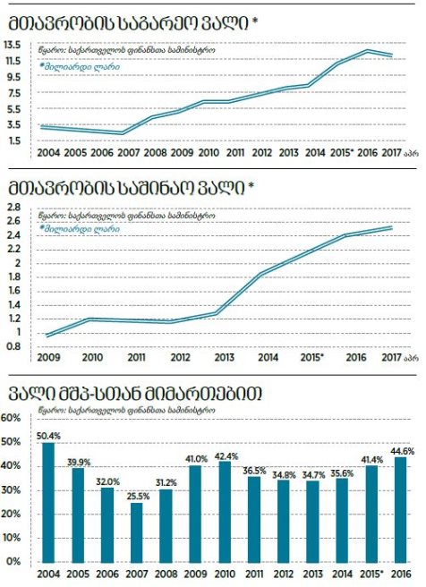 2017 წლის მდგომარეობით, საქართველოს ფინანსთა სამინისტროს მონაცემებით, მთლიანი სამთავრობო ვალი 13.9 მილიარდი ლარია, საიდანაც 11.3 მილიარდი ლარი საგარეო ვალია, ხოლო 2.6 მილიარდი ლარი – საშინაო ვალი.