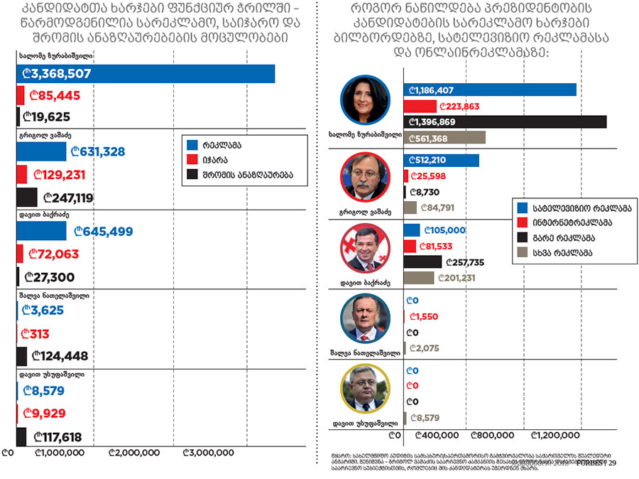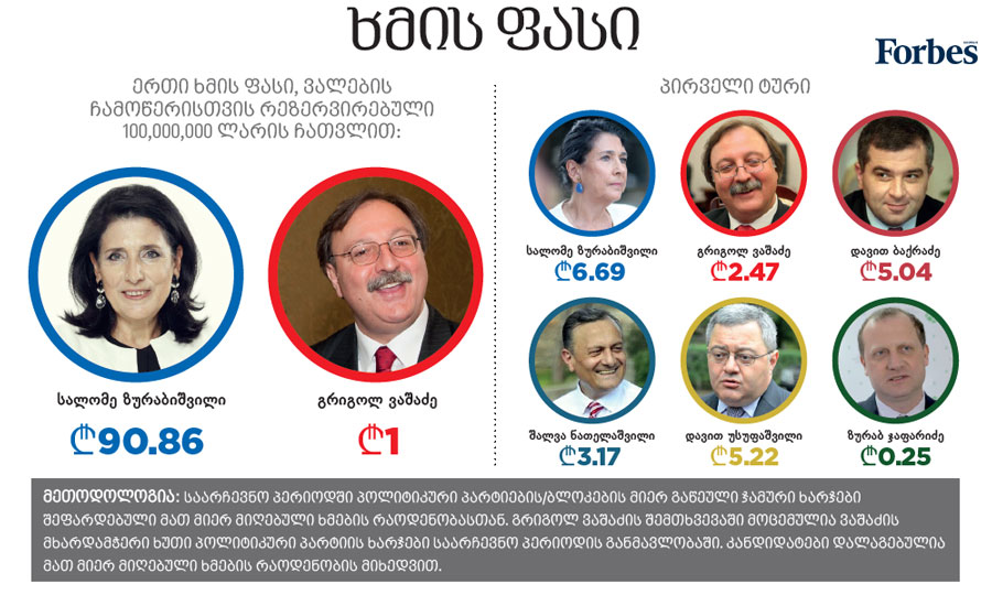 28 ნოემბერს სალომე ზურაბიშვილს ხმა 1,147,677 ამომრჩეველმა მისცა, ხოლო გრიგოლ ვაშაძეს – 780,655- მა. თუ 28 ოქტომბრიდან 28 ნოემბრამდე ორი საპრეზიდენტო კანდიდატის შემოსავლებს შევადარებთ, ვნახავთ, რომ ზურაბიშვილმა შემოწირულებების სახით 4,436,722,73 ლარი მიიღო, ხოლო ვაშაძემ – 781,933 ლარი.