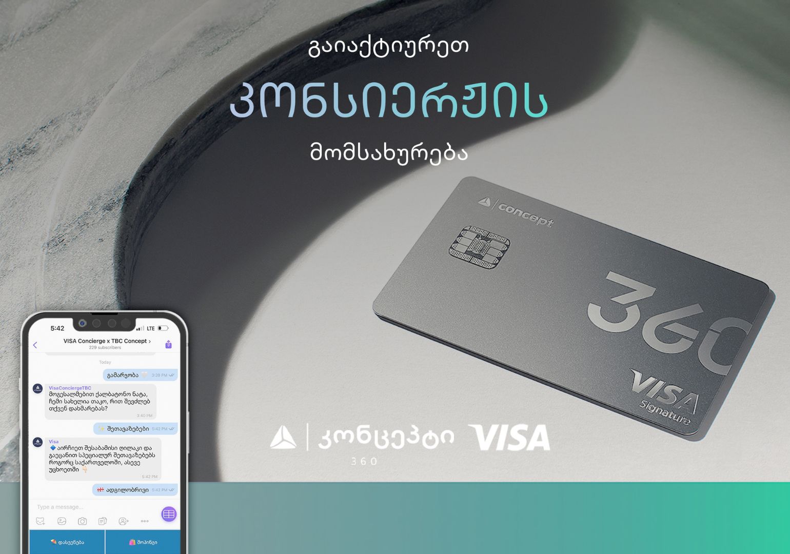 დღეიდან, თიბისი კონცეპტ 360 ნაკრების მფლობელებს შესაძლებლობა აქვთ, Viber-ის არხში ისარგებლონ Visa კონსიერჟის და ჩატბოტის მომსახურებით 24/7-ზე, ნებისმიერი ადგილიდან.