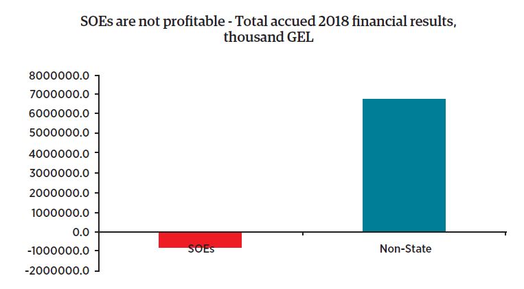 In 2018, SOEs ended up with operating losses of -739,237.4 thousand GEL (total accrued financial results), while their private peers finished with a profit of 6,665,068.7 thousand GEL. This trend, which has been the same for the last few years, threatens not only companies’ financial stability and their social roles, but also it endangers important state assets through degradation.