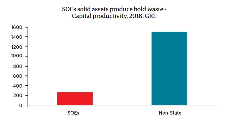 SOEs have a glut of fixed assets, but given they do not make a profit, this infrastructure is wasted. The capital productivity of SOEs (output per 1,000 GEL of fixed capital) equates to 260 GEL, while privately-owned enterprises’ capital productivity reaches 1,491 GEL.